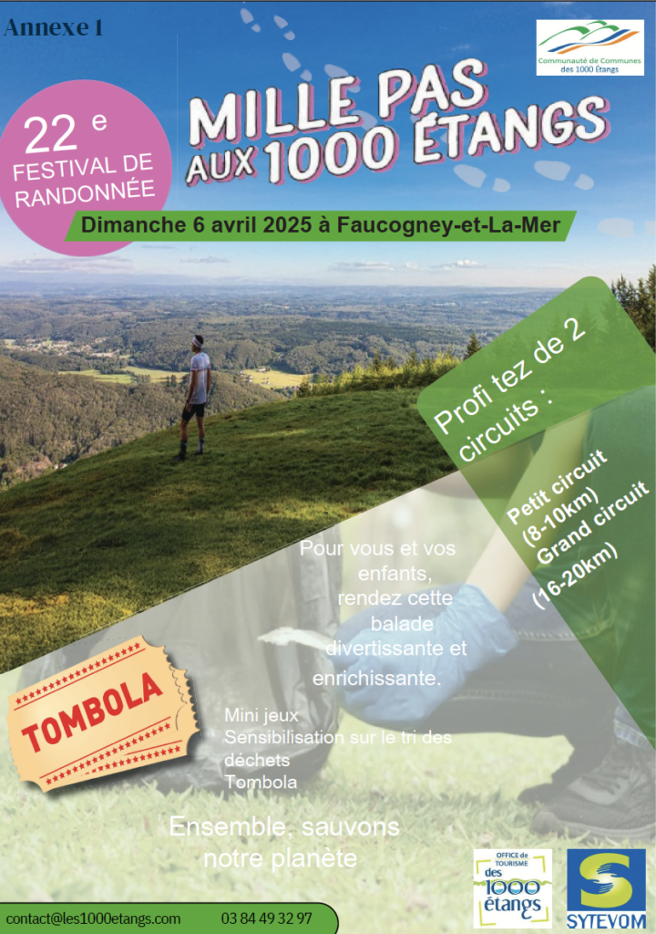 Enfin, j’ai réalisé une affiche pour le festival de randonnée « Mille Pas aux 1000 étangs », qui présente les informations importantes au lieu même de la randonnée.